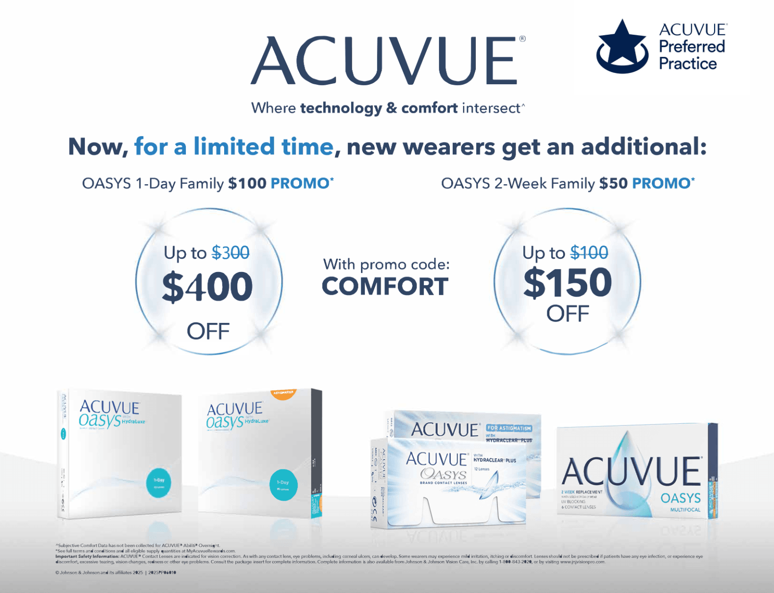 Get up to $150 off as an existing wearer or up to $300 off if you’re new to Acuvue Oasys.